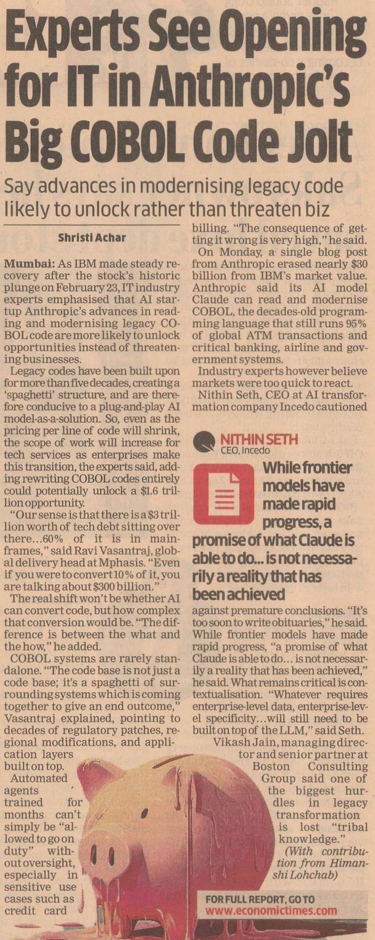 Experts See Opening for IT in Anthropic's Big COBOL Code Jolt February 26, 2026 Ravi Vasantraj, Global Delivery Head, Mphasis quoted in The Economic Times Know More Stories Coverage report_Mphasis and Flagstar Bank Mark Major Milestone by Completi... April 02, 2026 From paper piles to predictive power: AI at the heart of citizen-centred g... March 23, 2026 Coverage report_Mphasis urges CTOs to rethink legacy core as HFS research ... March 23, 2026 Women Leaders Building Institutions for Lasting Social Impact March 16, 2026 View all