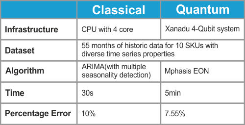 Mphasis EON standardizes the classical data to bring all the values in a range of [0,1], to reduce the big number effect on machine learning. After standardization, input data is manipulated to prepare enhanced feature space that can better represent classical data on quantum systems for predictive tasks. The transformed feature space is mapped onto quantum systems using quantum state preparation such as angle embedding, amplitude embedding etc. Quantum circuits perform a defined series of operations on quantum data and measure the system information using the measurement function. The output from measurement functions becomes the input to deep neural network layers. The resultant cost function resides on the classical machine. The measured error is reduced by back propagation and different gradient descent methods.